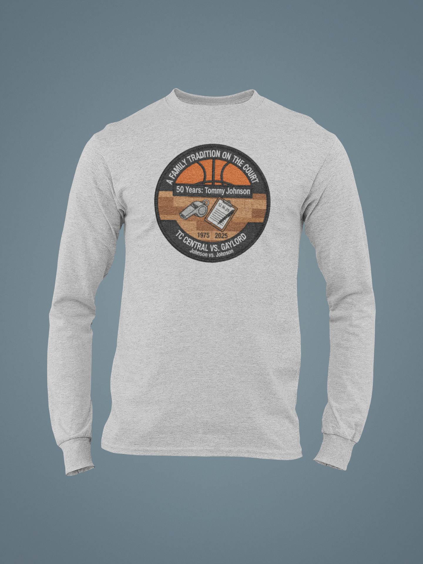 The shirt features a bold center graphic highlighting 50 Years: Tommy Johnson, complete with a basketball court theme, whistle, and score sheet artwork. The bottom banner calls out the matchup: TC Central vs. Gaylord – Johnson vs. Johnson, marking a one-of-a-kind family milestone.