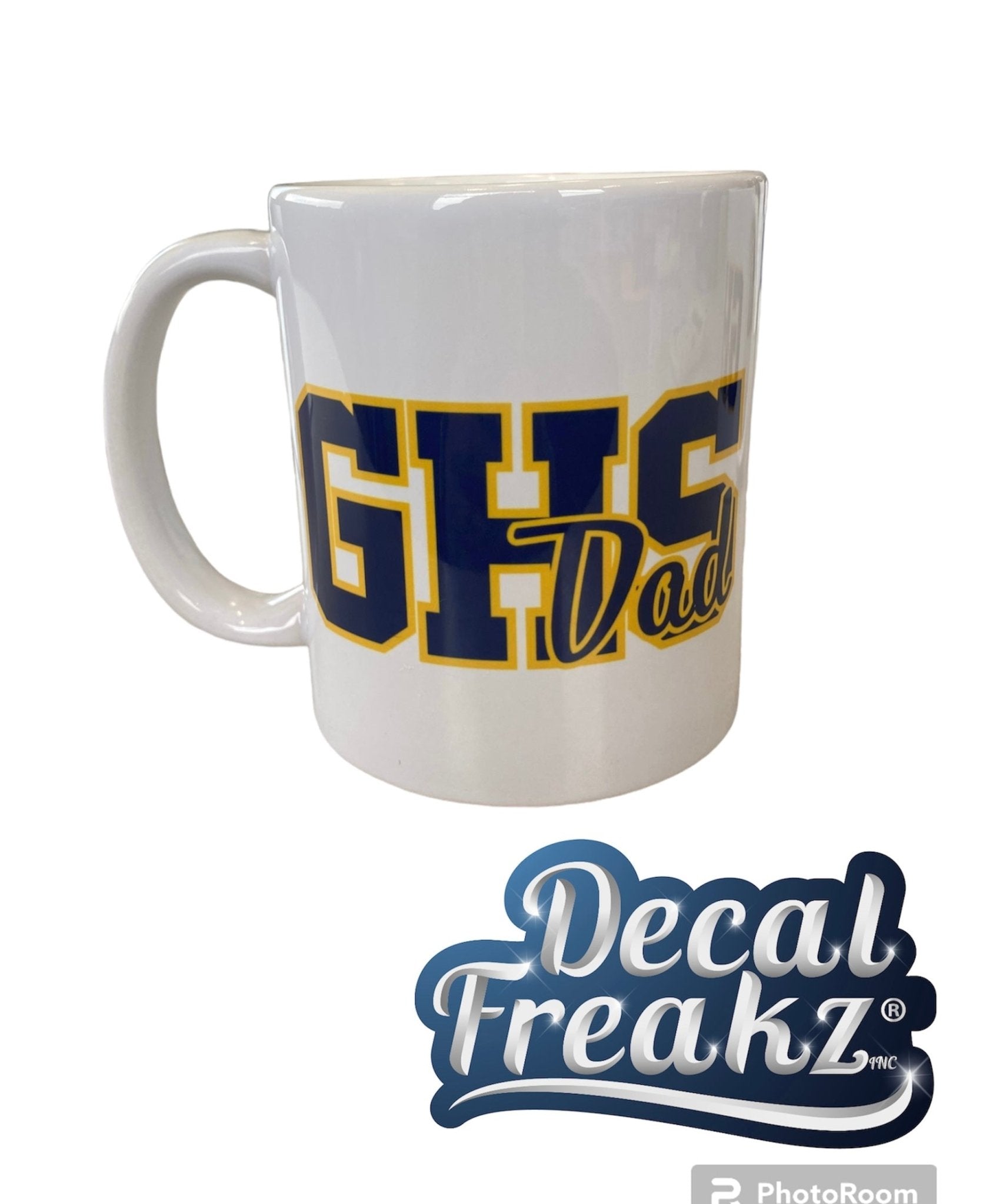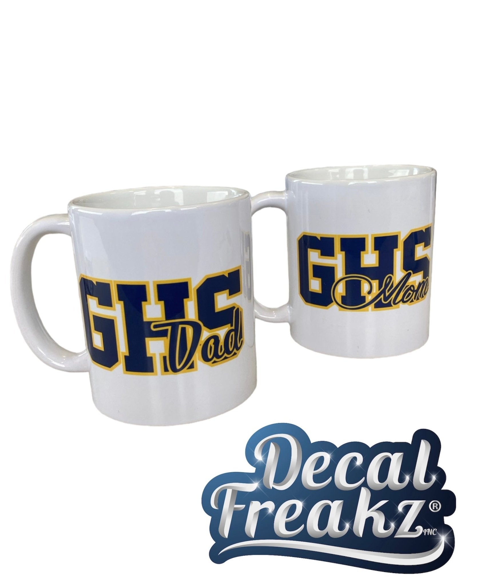 Show your pride for your student at GHS with our GHS Mom or Dad 11oz Coffee Cup. This elegant white coffee cup features the bold letters "GHS" in striking blue and gold, representing the school's colors. What makes this cup extra special is the option to choose between "Mom" or "Dad" to customize it according to your role and support for your GHS student.