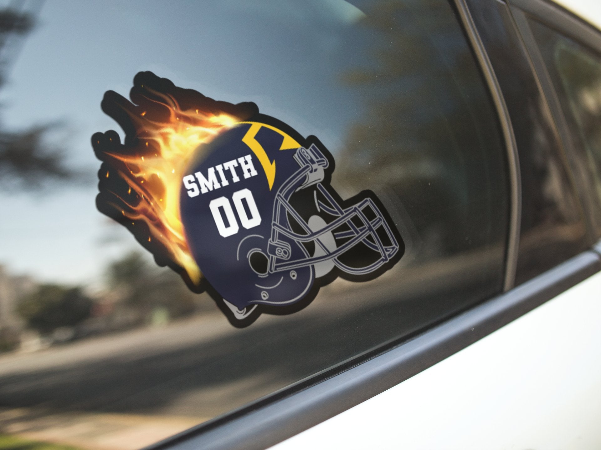 This decal measures 5 inches and features a Gaylord High School football helmet, complete with flairs of fire streaming off its back. The side of the helmet can be customized with a name and player number and is composed of laminated vinyl that is both UV and weather-resistant, ensuring a durable 5-year lifespan with appropriate install and maintenance.