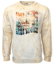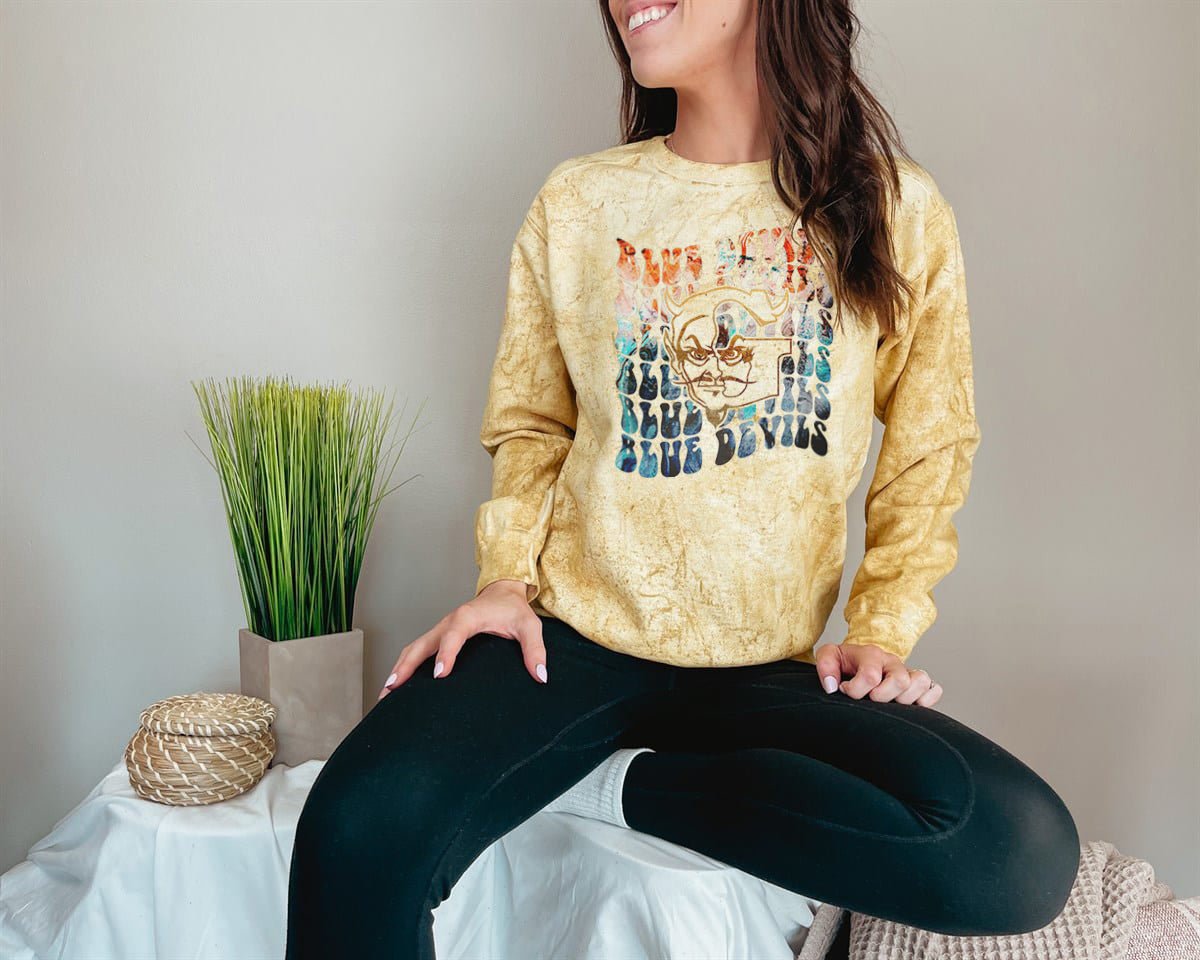 Introducing the must-have addition to your wardrobe - the Citrine Color Blast Crewneck for Gaylord High School Blue Devils! This crewneck features a unique and eye-catching design that's sure to turn heads. The 6 stacked wavy retro font "Blue Devils" with the Devil G positioned on top in the middle is printed in multicolor, featuring reds, oranges, and blues.