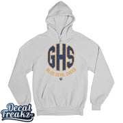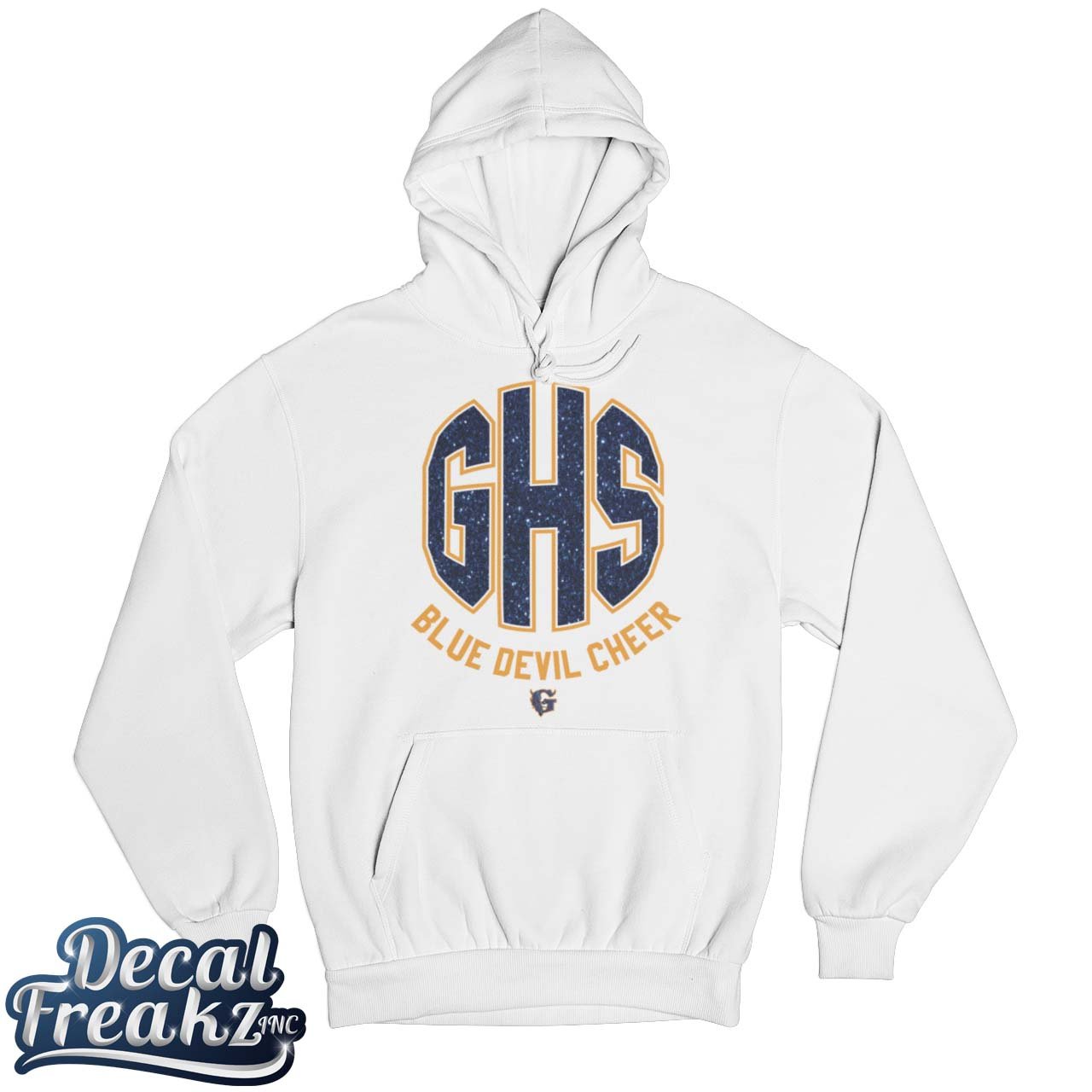 This Hooded Sweatshirt is a unisex fit and is available in many color options. This hoodie features a bold monogrammed style GHS in navy glitter, with a gold outline. "Blue Devil Cheer" Is arched underneath in matching gold. The navy glitter in this is a true glitter, and will shine/reflect in the sun.
