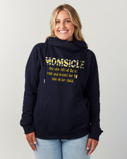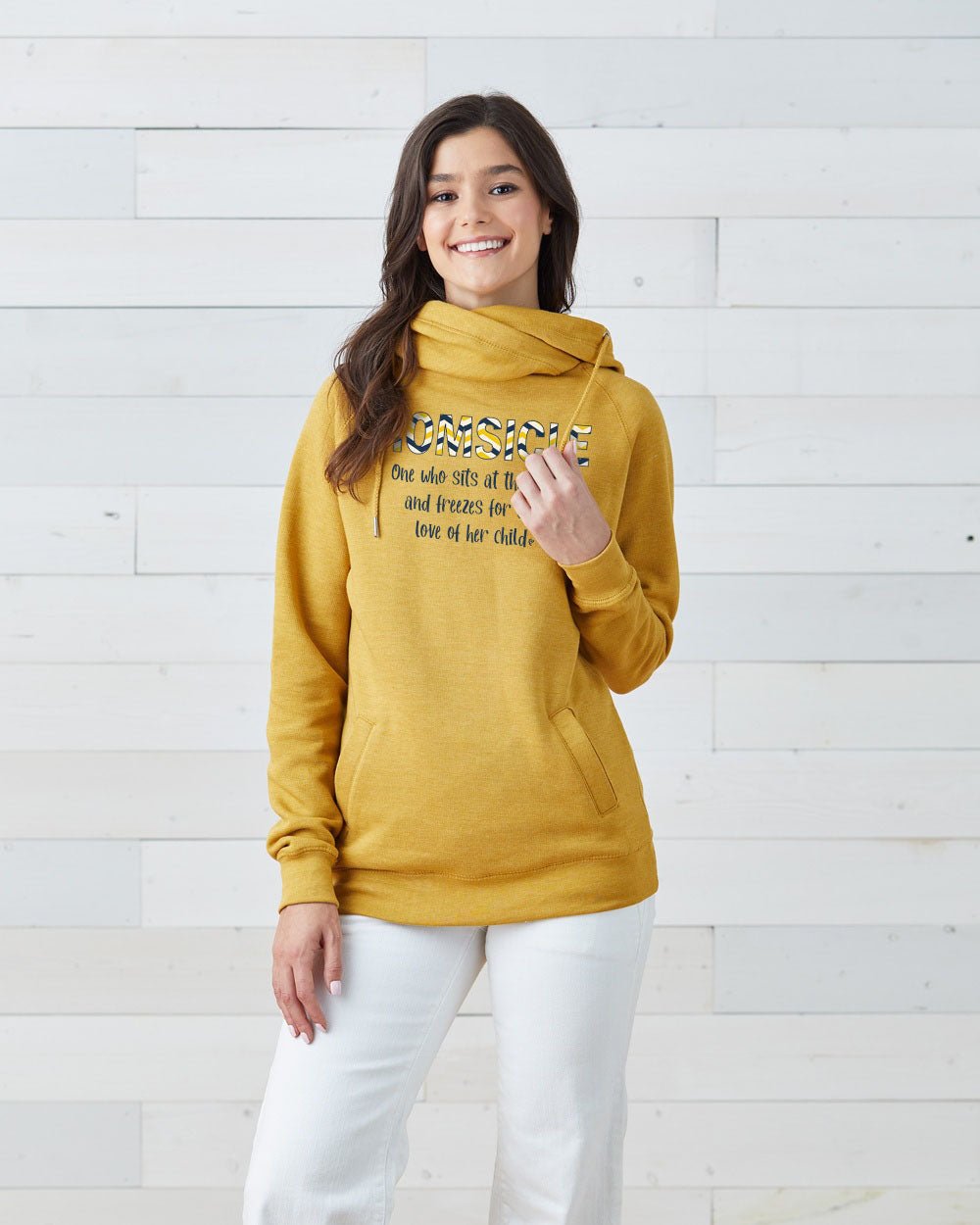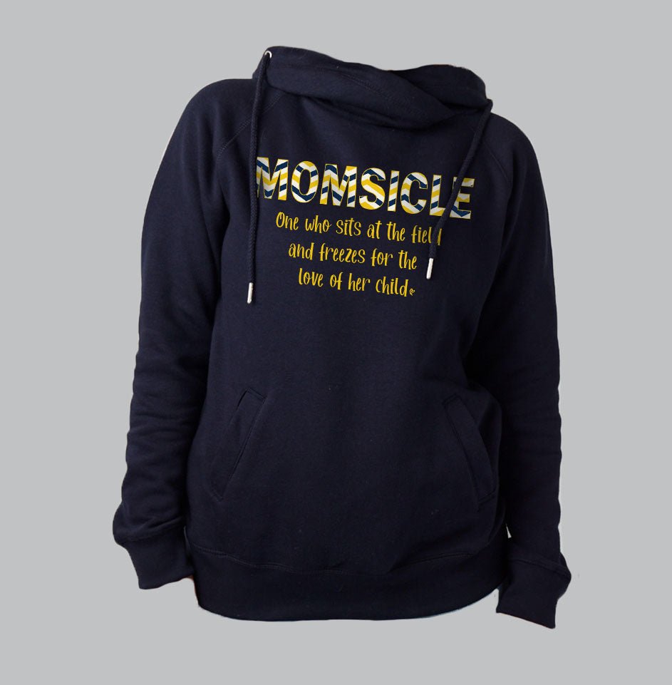 Available in navy or gold, this cozy funnel neck hoodie features the endearing term "Momsicle" emblazoned in a striking blue and gold chevron print. Underneath, it playfully defines a "Momsicle" as "One who sits at the field/rink and freezes for the love of her child."