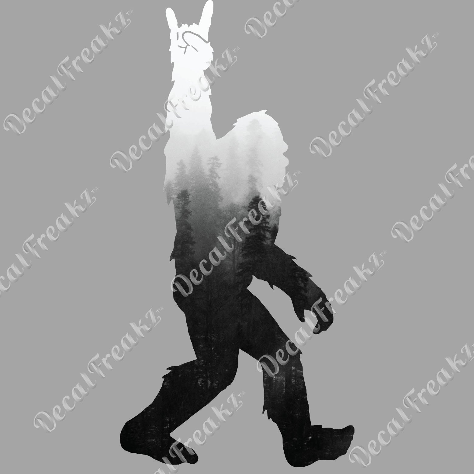 Introducing our Dark Trees Cutout Sasquatch Vinyl Decal! This unique decal features a black and white forest with a silhouette of Sasquatch emerging, creating a mesmerizing visual.