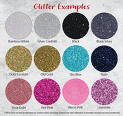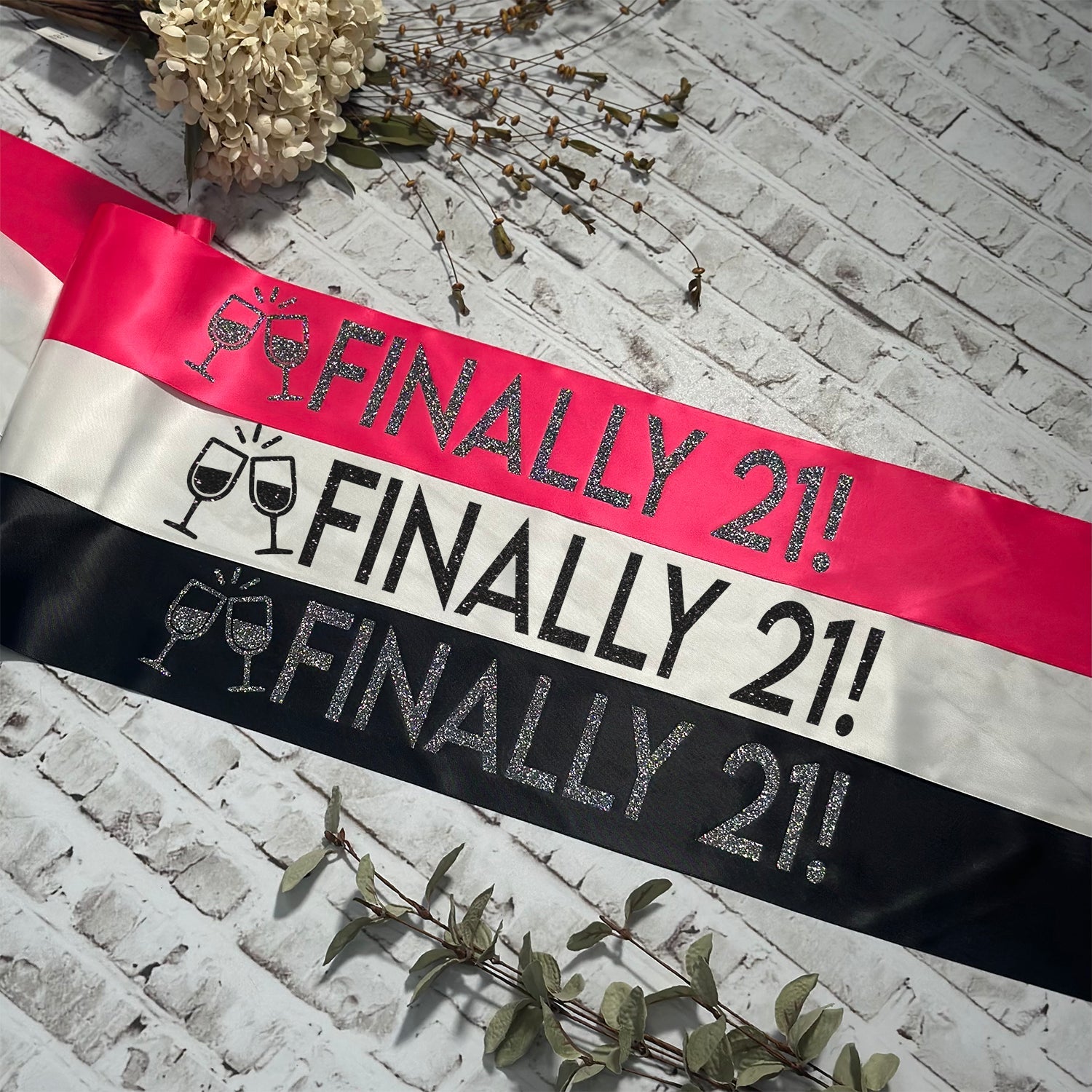 This 86" long sash is offered in 3 various ribbon hues; Hot pink, Black, and White, with a glitter "Finally 21!" with glasses mid cheers in front - displayed across the chest area. An array of glitter options is presented on a color chart. The sash's two angled ends meet at the bottom and can be secured using our Rhinestone safety pin.