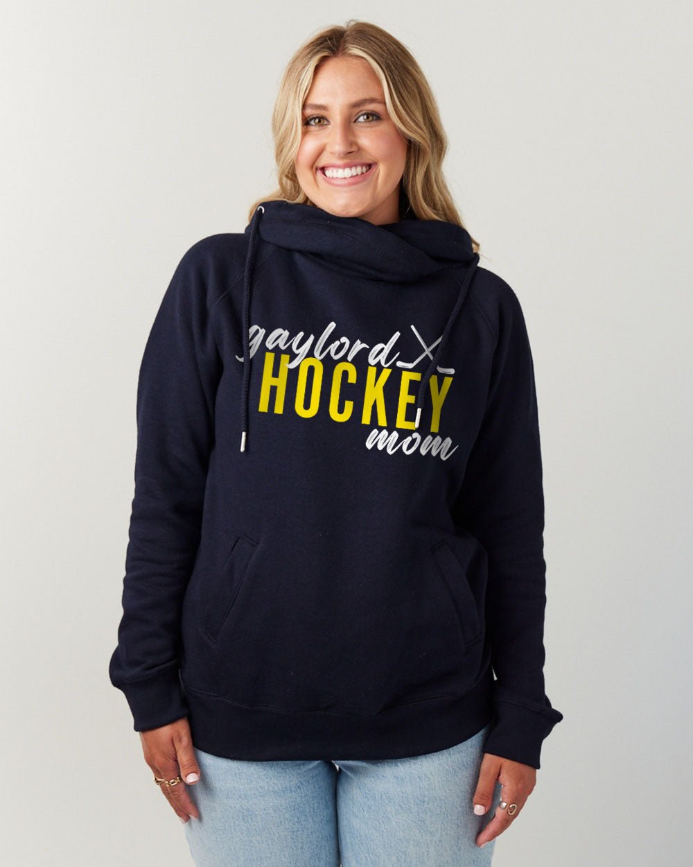 Introducing our Navy Funnel Neck Hoodie, the ultimate blend of comfort, style, and team spirit. Adorned with "Gaylord Hockey Mom" in elegant white and gold text on the front, this hoodie is a proud proclamation of your support for the Gaylord Hockey team.